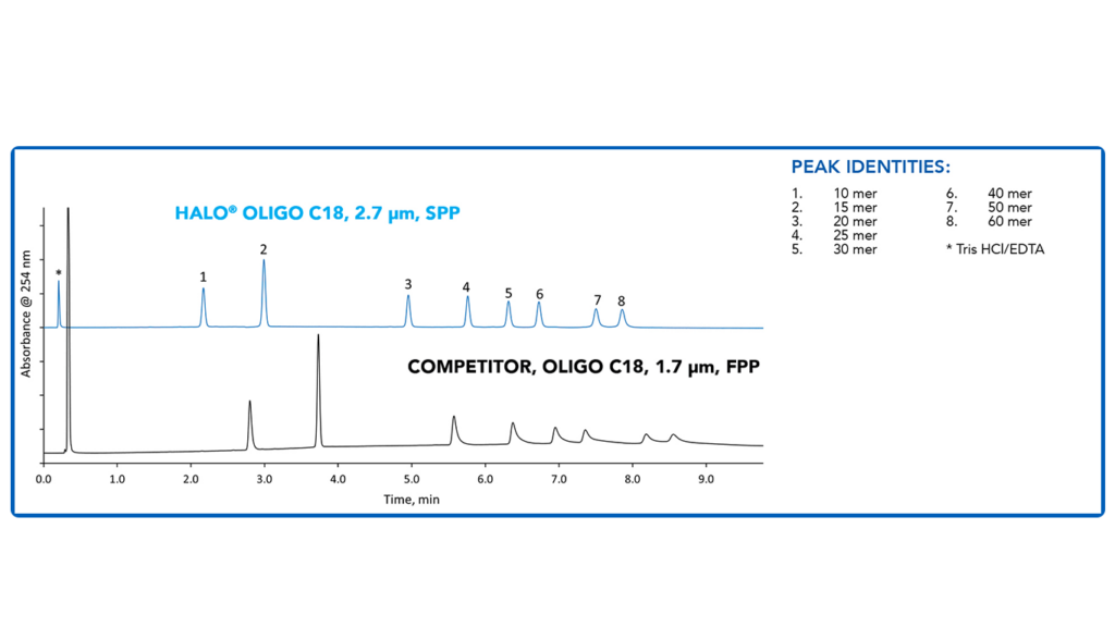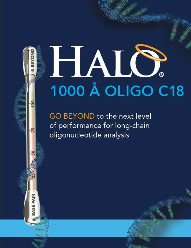 HALO® BIOCLASS oligonucleotide 管柱採用 AMT 獨家的 Fused-Core® 技術,專為 oligonucleotide 分析所設計,提供高效率且快速的分離表現。其中,OLIGO 120Å 管柱適用於一般 oligonucleotide 分析;OLIGO 1000Å 管柱則針對分子量較大、結構較為複雜的 oligonucleotide,提供更佳的分離效能。